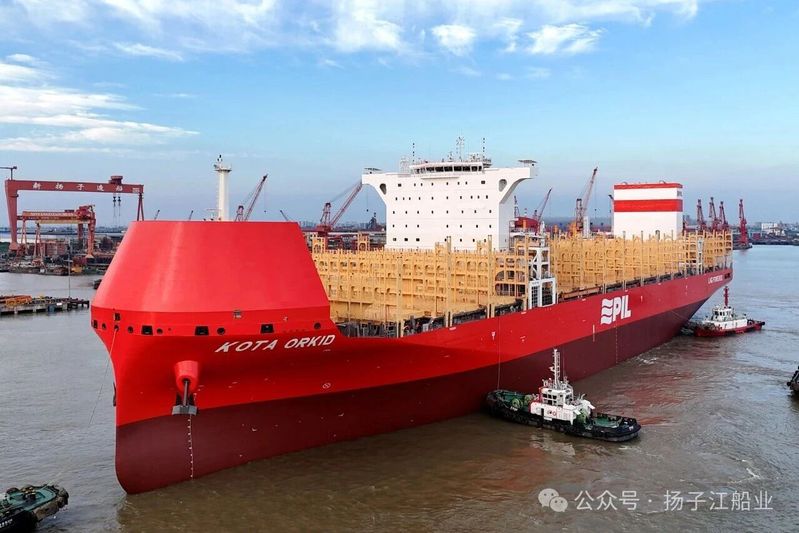 11月4日上午,扬子江船业集团新扬子造船为新加坡太平船务(PIL)建造的第四艘8200TEU薄膜型LNG双燃料集装箱船“KOTA ORKID”轮,解缆离开船厂码头,交付投入运营。